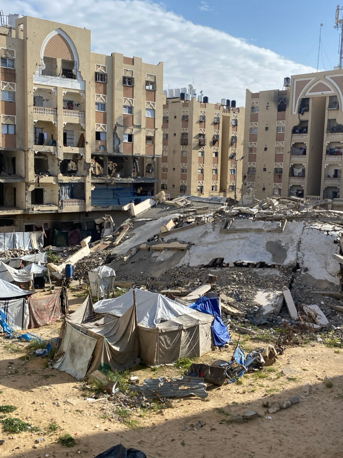The image captures a scene of extensive structural damage and makeshift habitation in Khan Yunis, Palestinian Territory, under a partly cloudy sky. In the background, multiple multi-story residential…read more