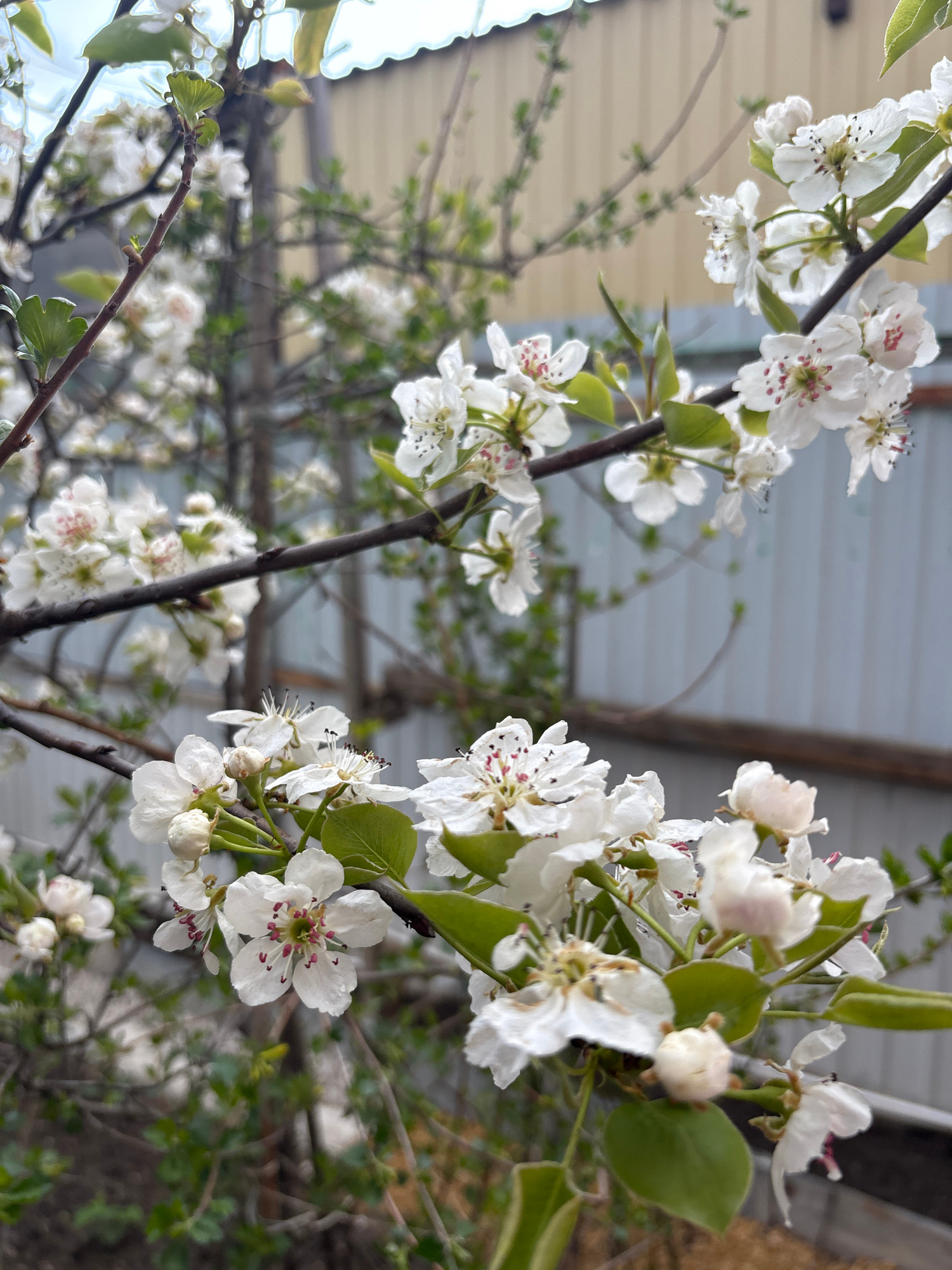 The image shows a close-up of blooming white flowers on tree branches. The flowers have a delicate, five-petal structure with pink-red stamens in the center. Green leaves are interspersed amongst the…read more
