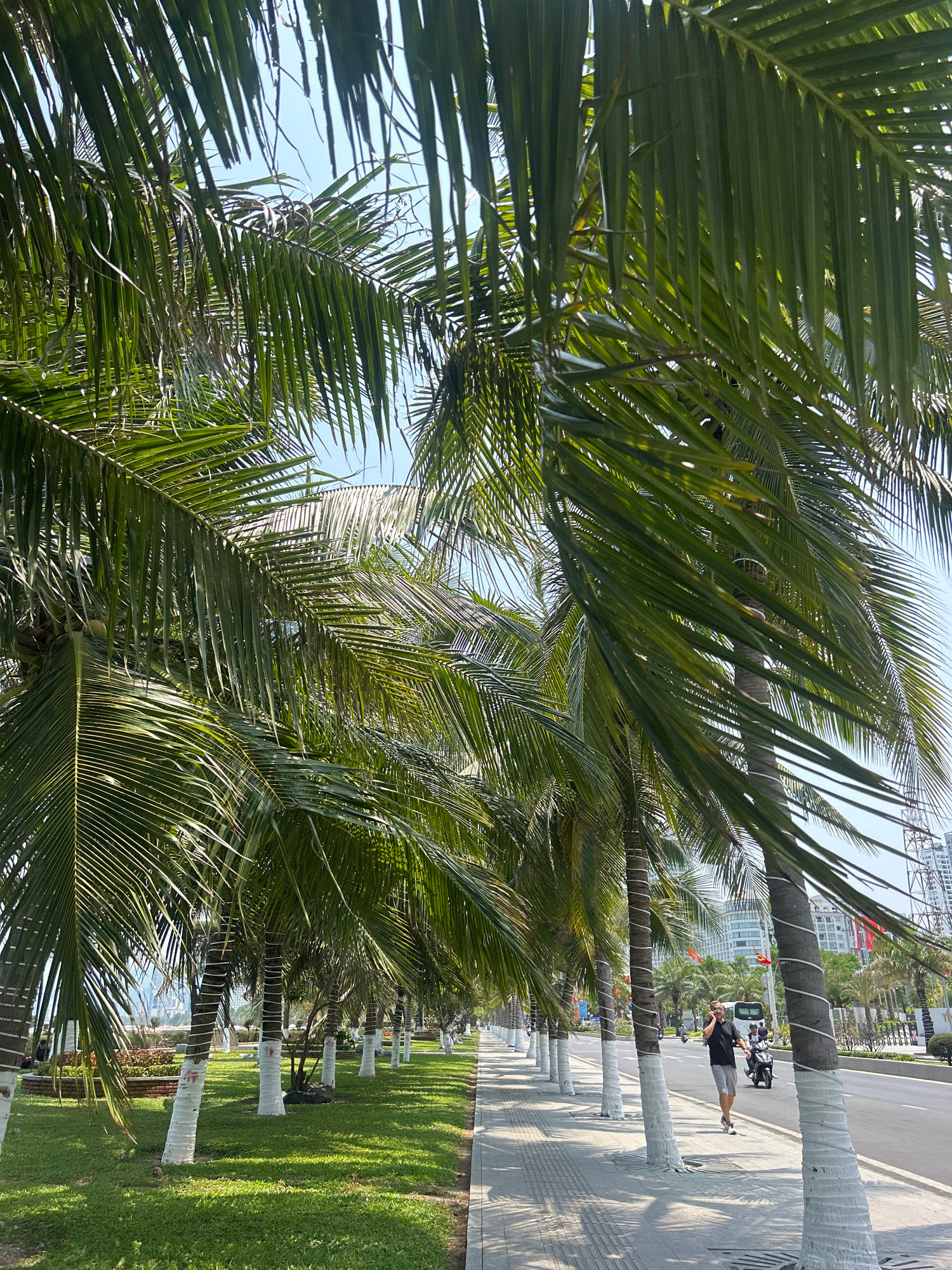 The image shows a sidewalk scene in Nha Trang, Vietnam. Tall palm trees line the sidewalk, their trunks painted white at the base. On the sidewalk, a person is walking. In the background, there is a r…read more