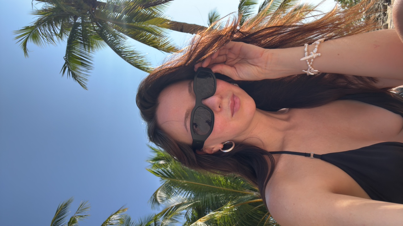 A young woman with long brown hair and black sunglasses smiles into the camera. She is wearing a black bikini top and a white beaded bracelet with a starfish charm. Palm trees are visible in the backg…read more