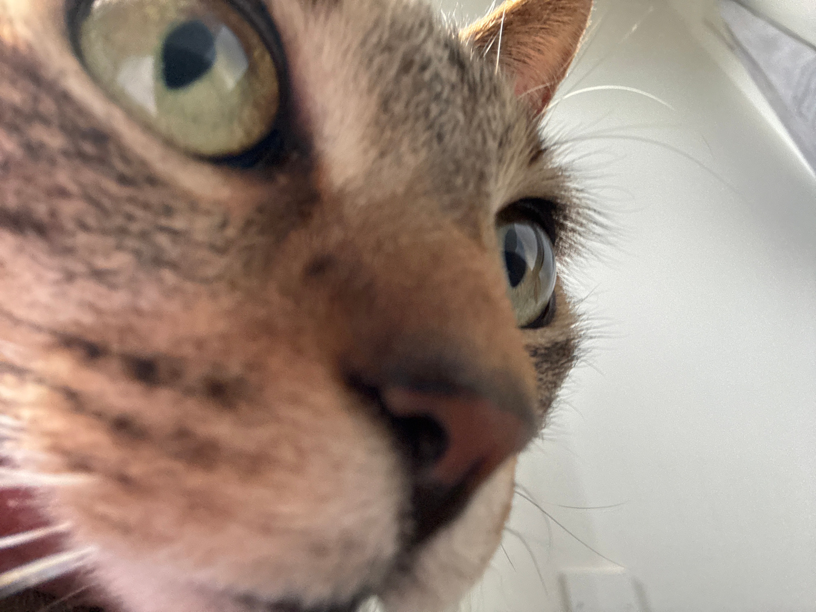 The image is an extreme close-up of a cat's face, focusing on its eyes, nose, and fur. The cat appears to be a tabby, with brown and black striped fur. One eye is greenish-yellow, and the other is blu…read more
