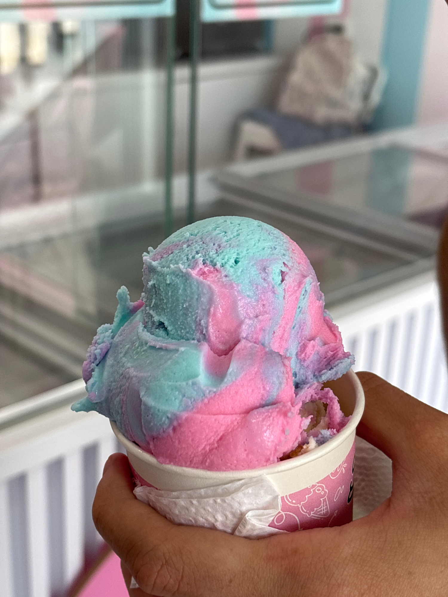 A close-up shot shows a hand holding a paper cup filled with multicolored ice cream. The ice cream is predominantly pink and blue, swirled together. The cup has a white rim and a pink exterior with ca…read more