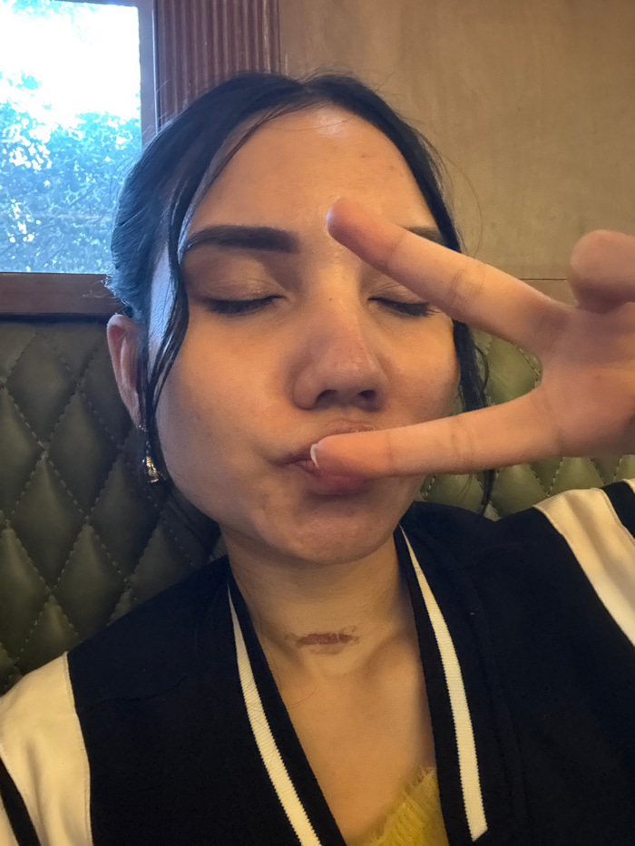 The image presents a headshot of a young adult female in an indoor setting within Kolkata, India. She has dark hair styled back with front strands. Her eyes are closed, and her lips are pursed in a "k…read more
