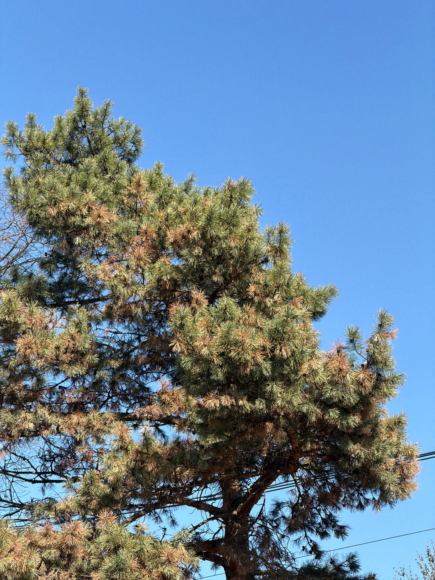 A low-angle, wide-shot image shows a portion of a tree against a clear blue sky. The tree has green and brown needles, with some bare branches visible. Several power lines run through the tree's canop…read more