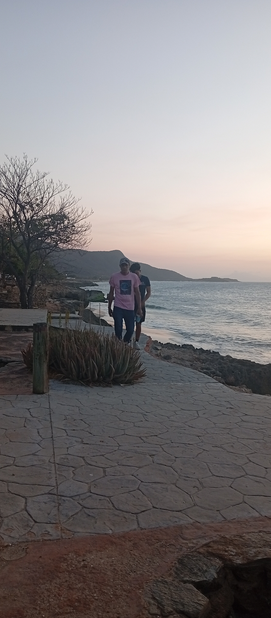 The image depicts a scene on a seaside promenade in Juan Griego, Venezuela, at dusk. Two men are walking along a paved path that borders the coastline. The first man is wearing a light pink t-shirt, j…read more