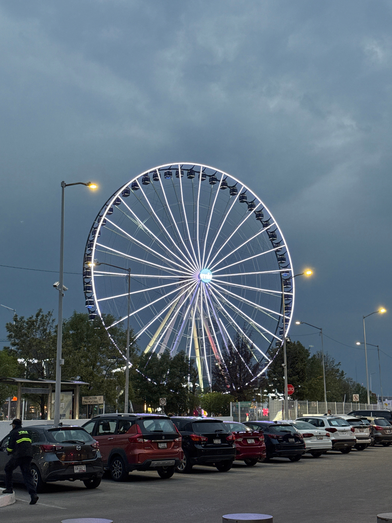 The image depicts a large Ferris wheel in Puebla, Mexico, illuminated at night. The sky is a dark, cloudy gray. A row of parked cars, including red, white, and dark-colored models, line the right side…read more