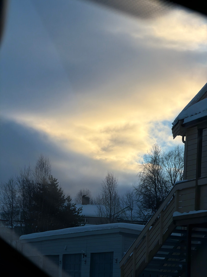 The image displays a winter scene in Tromsø, Norway, captured through a dark-edged frame suggesting a window or vehicle. The sky dominates the upper two-thirds, presenting a dramatic cloud formation.…read more