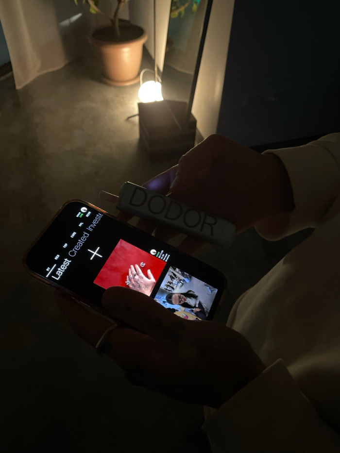 The image captures a close-up view of a person's hands interacting with two objects in a dimly lit environment, likely at night. The foreground is dominated by the hands and the objects they hold, whi…read more