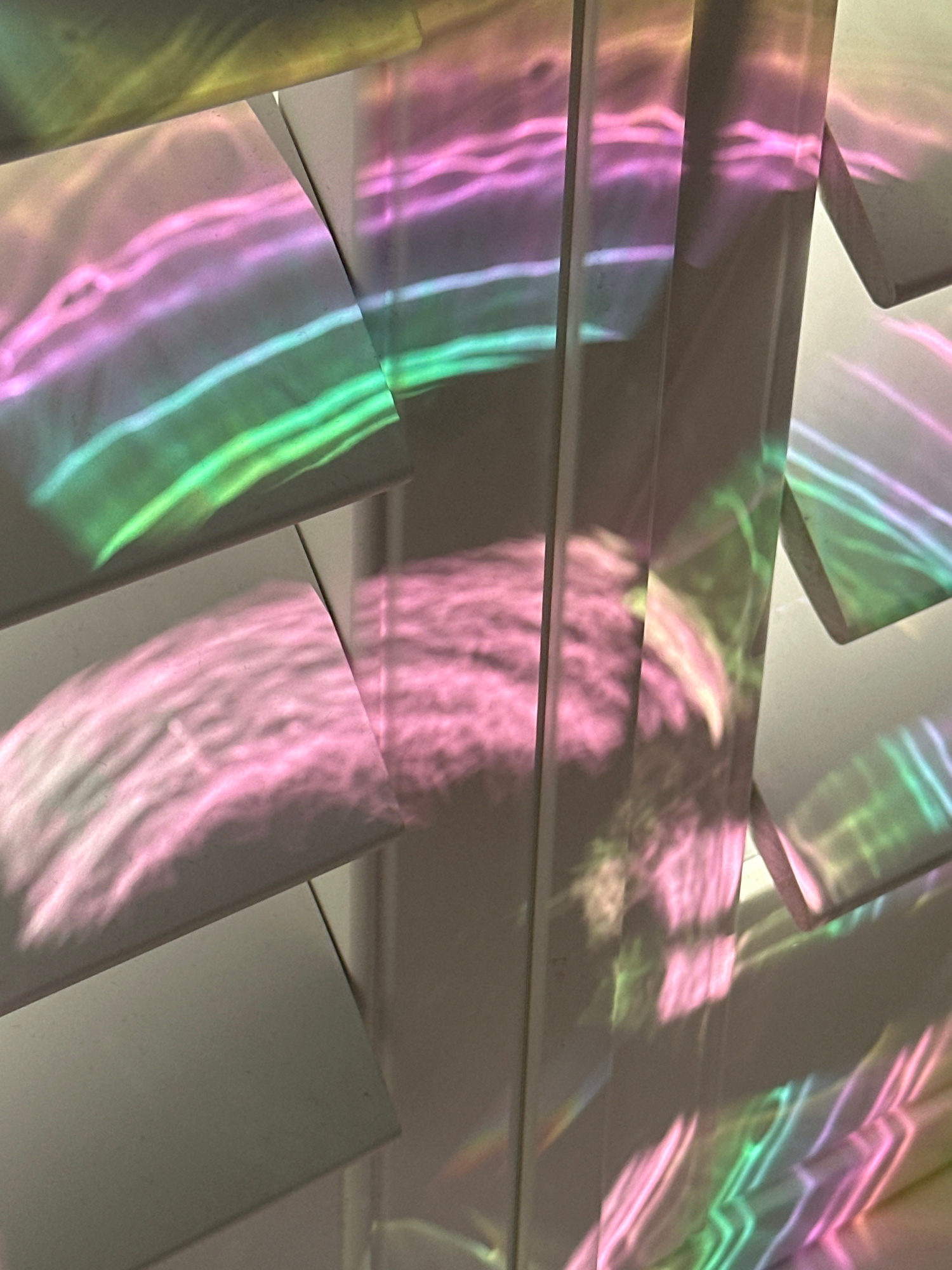 The image presents an abstract close-up of light refractions displaying a range of colors, including pink, green, and purple, across a series of white, horizontal surfaces. These surfaces appear to be…read more