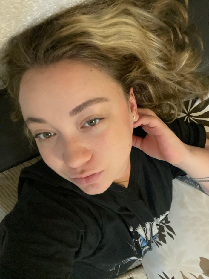 A fair-skinned person with light brown, wavy hair, green eyes, and defined eyebrows looks at the camera. They are lying down, head tilted, with a hand near their ear. They wear a black long-sleeved sh…read more