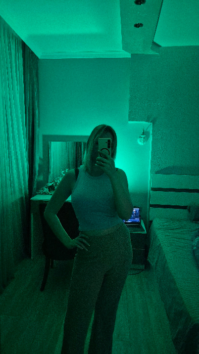 A woman takes a selfie in a green-lit room. She holds a phone up to her face, obscuring it. She wears a light-colored t-shirt and leggings. A bed and some furniture are visible in the background. The…read more