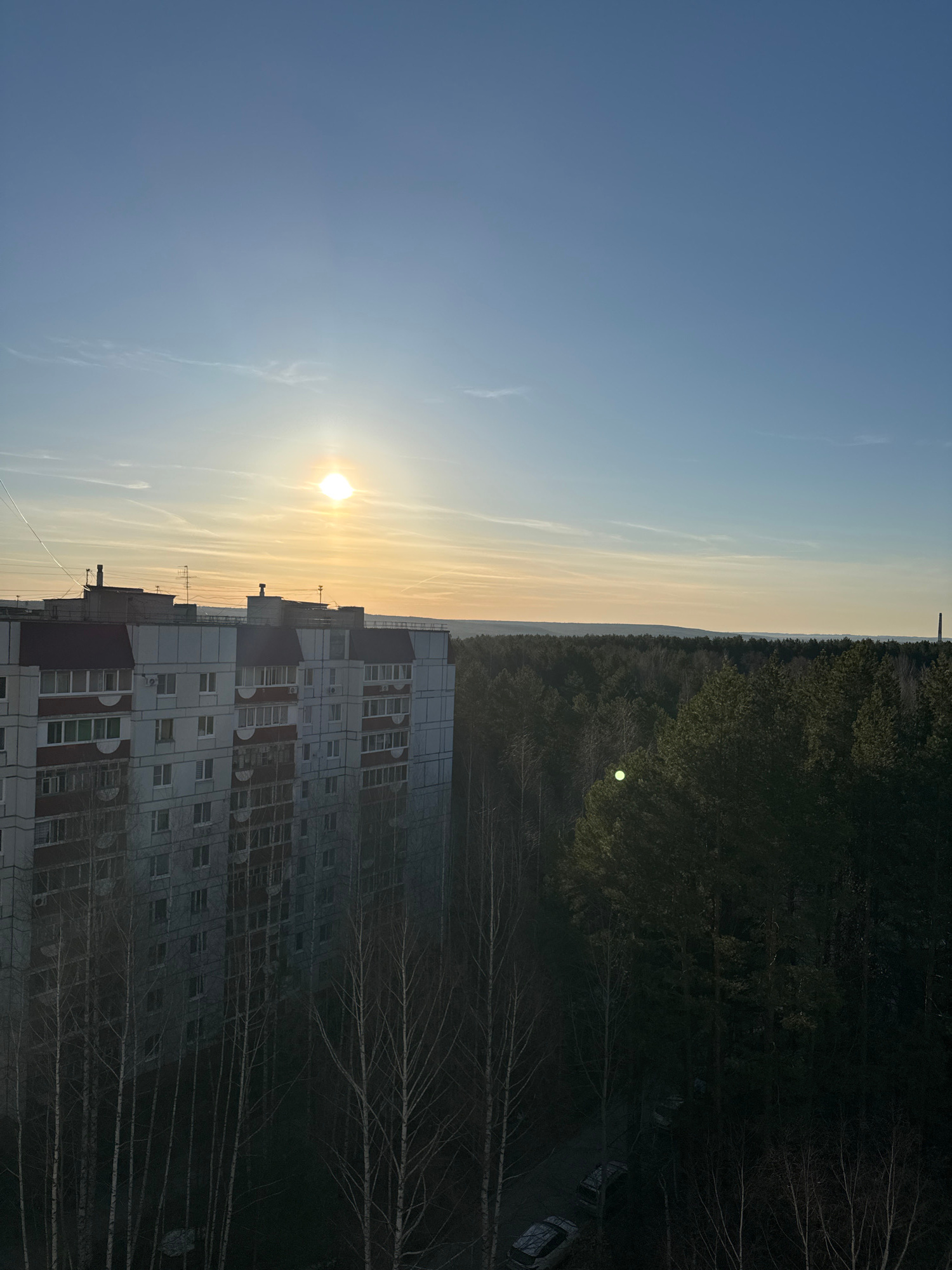 This image captures a serene urban-natural landscape, likely from a high vantage point such as an apartment window in Chaikovsky, Russia. The scene is dominated by a vast sky, transitioning from a cl…read more