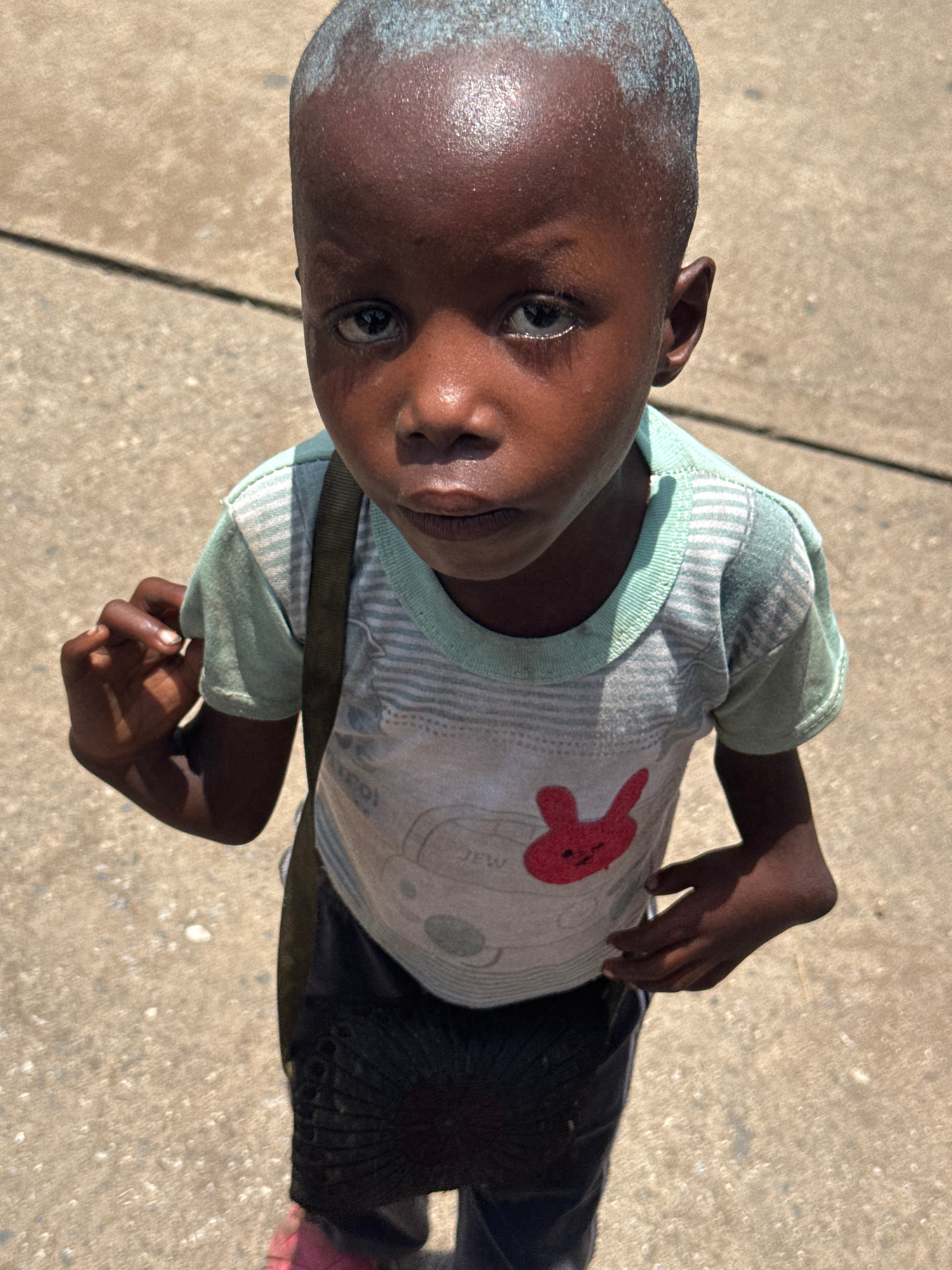 A young Black child is depicted in a high-angle, top-down shot, looking directly into the camera. The child has very short, close-cropped hair with a lighter, possibly dusty or painted, residue visibl…read more