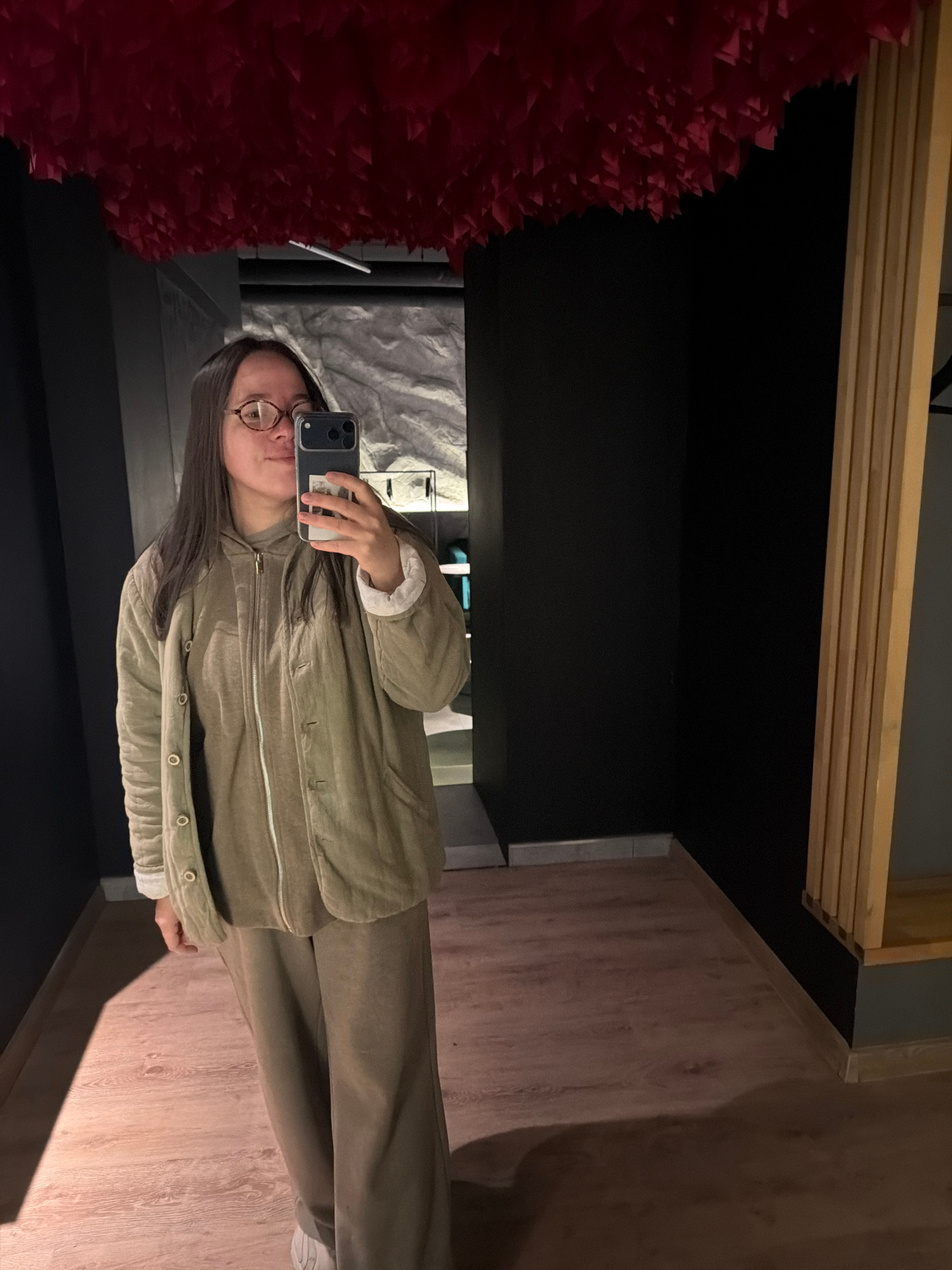 A young woman in glasses and tan clothing is taking a selfie in what appears to be a mirror. To her left is a dark wall with a red, textured surface. Behind her is a room with light-colored wood floor…read more