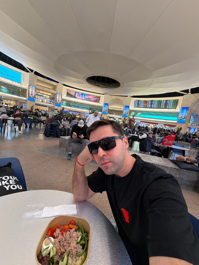 A man wearing sunglasses and a black shirt sits at a table with a salad containing tuna, tomatoes, green beans, and olives. The setting appears to be an airport waiting area, filled with people and laβ¦read more