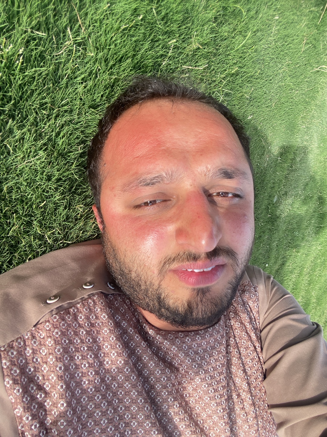 An adult man is depicted lying on his back on lush green grass, looking directly into the camera. The image is a close-up, taken from an overhead perspective, showcasing his face and upper torso. **S…read more