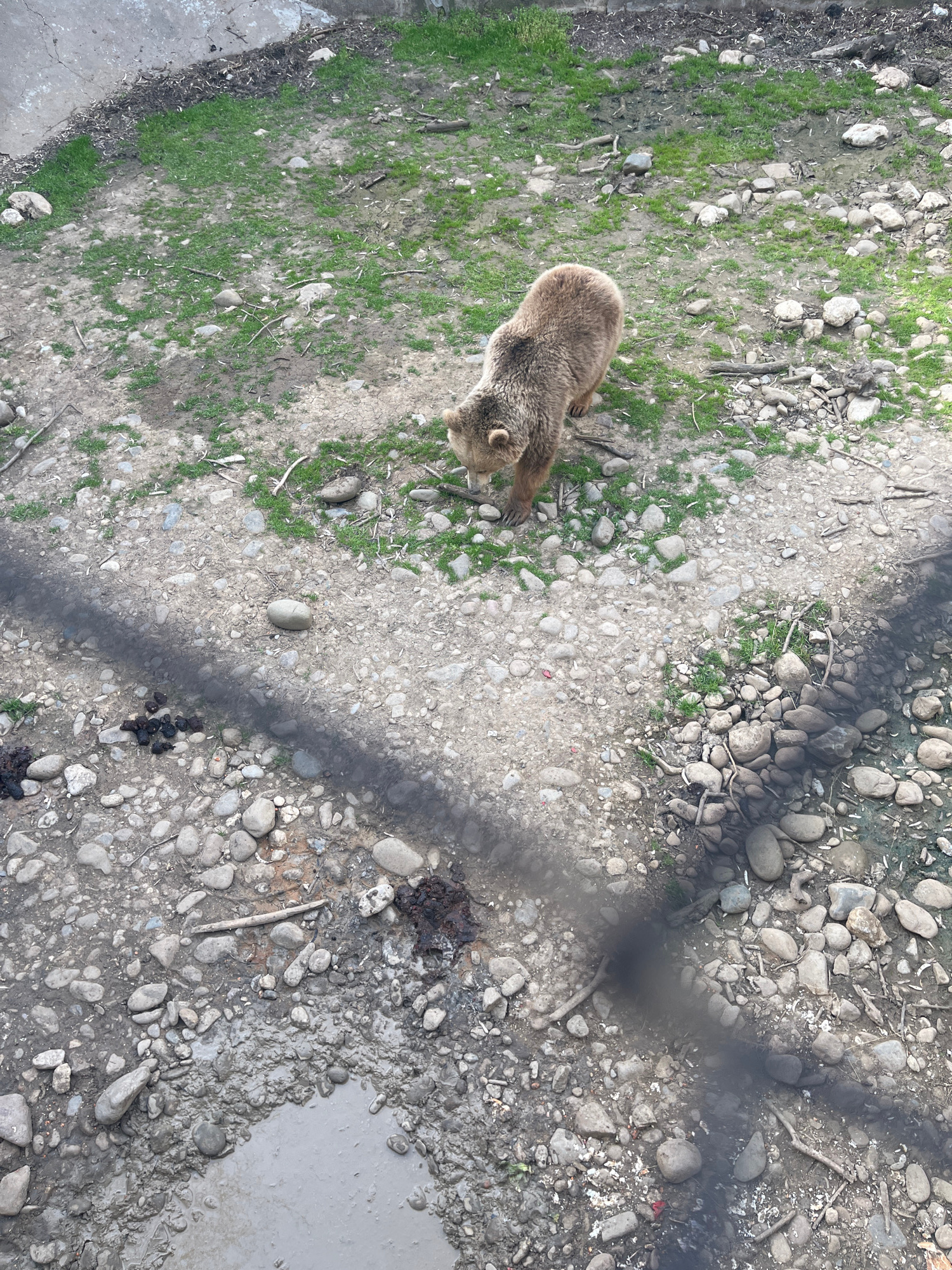 The image shows a brown bear standing on a ground covered with dirt, small rocks, and patches of green vegetation. The bear is positioned towards the left side of the image and is facing the upper par…read more