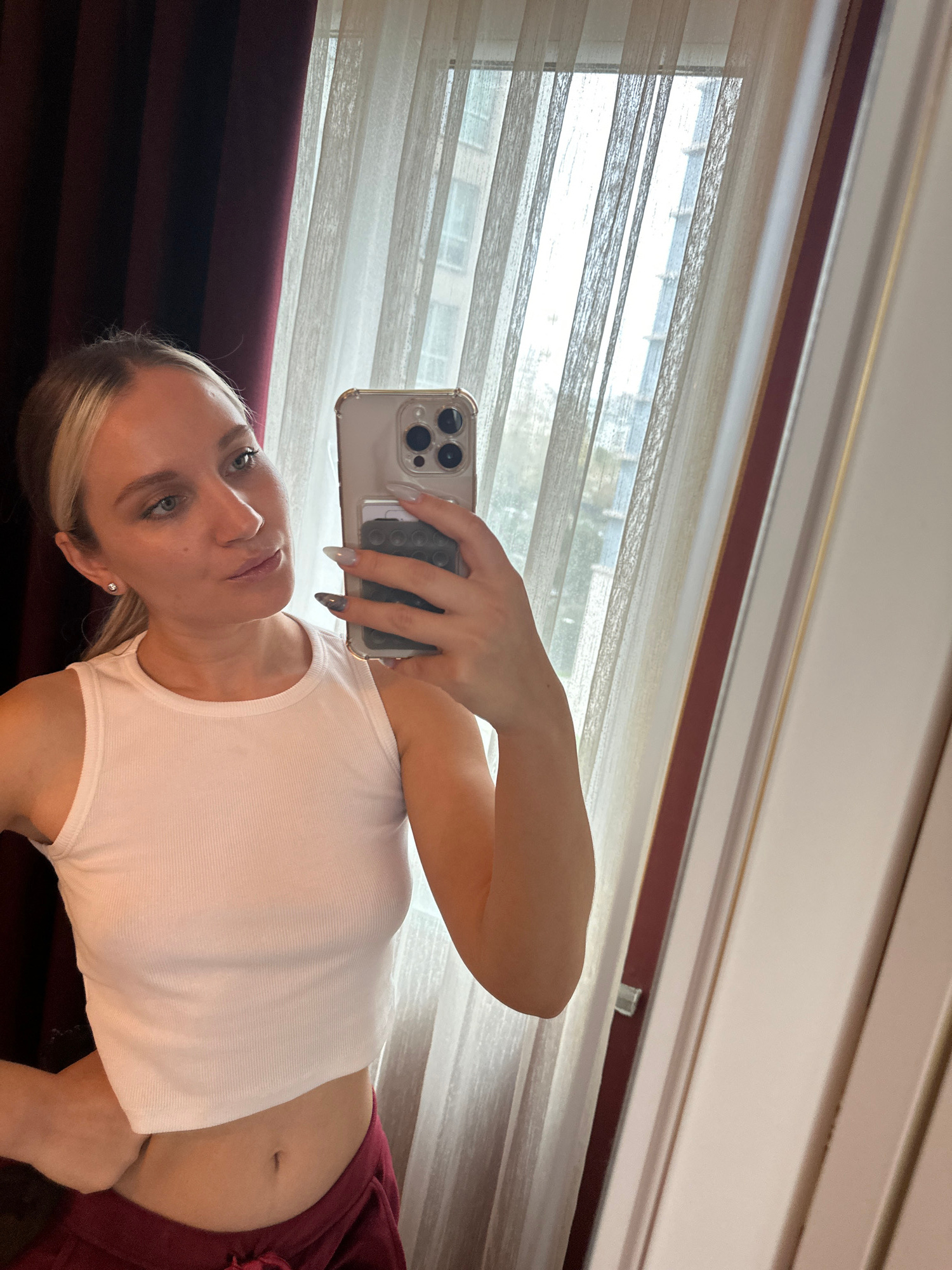 A woman is taking a selfie indoors. She is holding a smartphone in her right hand. She has blonde hair, fair skin, and blue eyes. She is wearing a white tank top and red pants. The background shows aβ¦read more