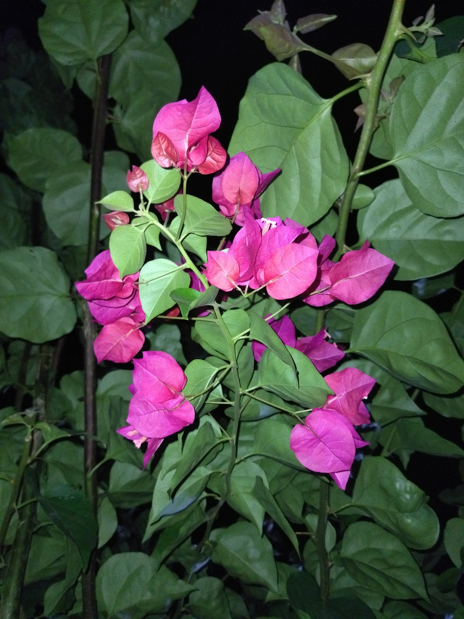 The image shows a bougainvillea plant with pink flowers and green leaves. The plant is in Tinaquillo, Venezuela. The background is dark. | Open Wire