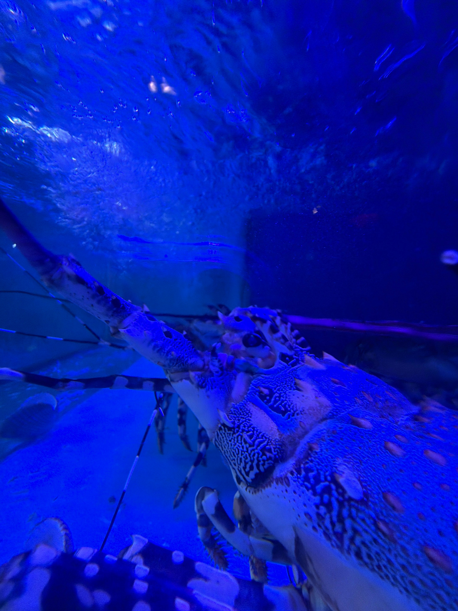 A patterned lobster is viewed inside a blue-lit aquarium. The image appears to be taken at the Đà Nẵng aquarium, Vietnam. The lobster’s body and claws exhibit a mottled pattern of dark spots on a ligh…read more