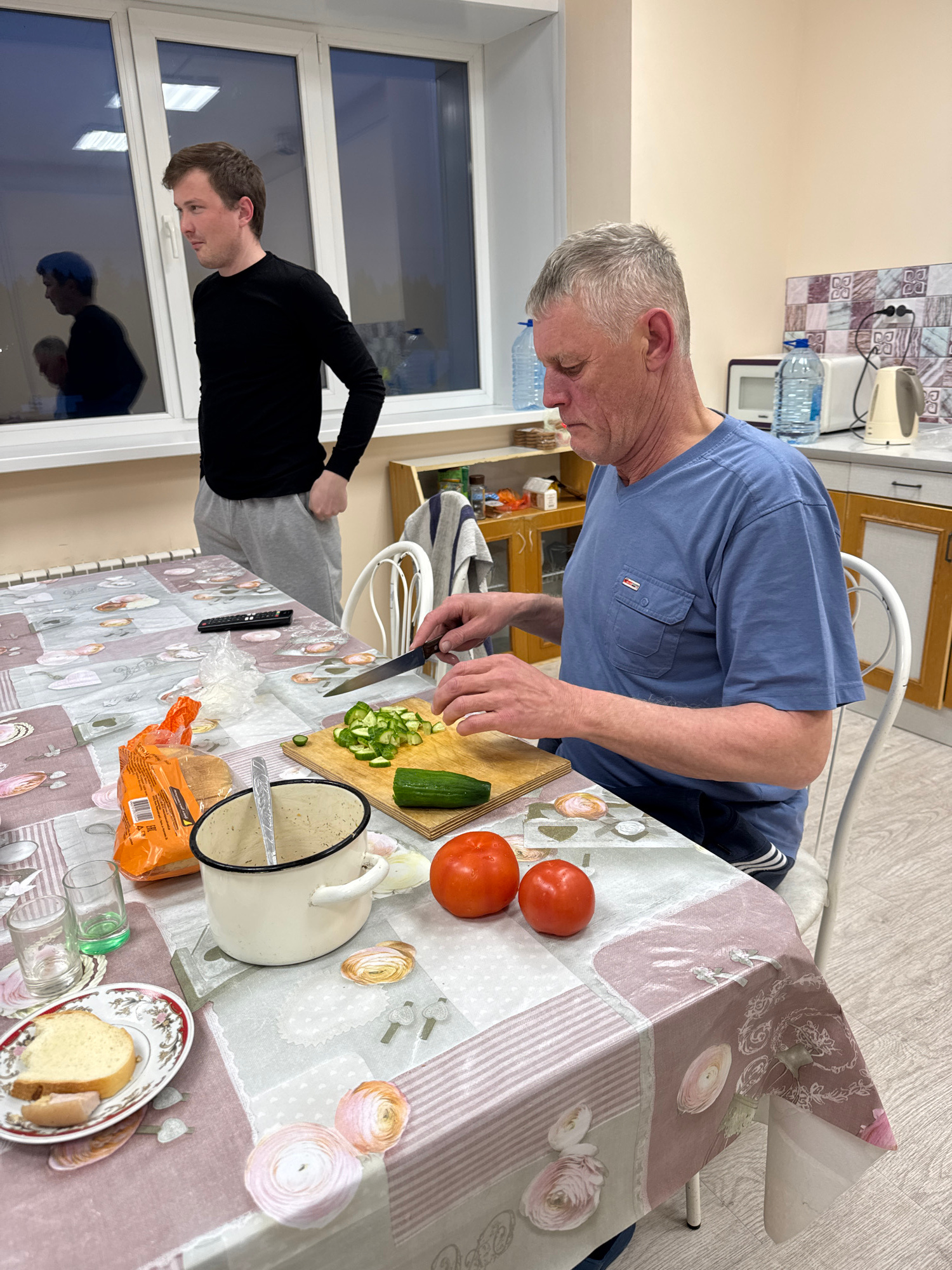 This vertically oriented image captures a casual indoor scene of food preparation, likely in a kitchen or dining area. Two men are featured: an older man and a younger man. The older man, with short…read more