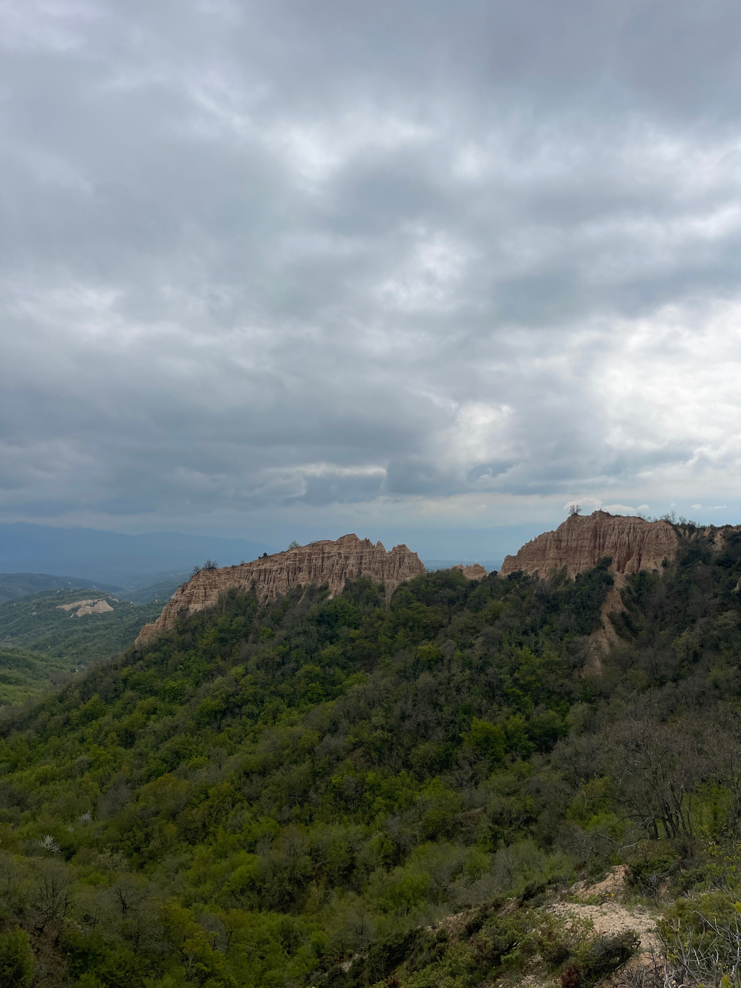 The image captures a landscape near Rozhen, Bulgaria. A rock formation with sharp peaks borders a green, tree-covered hillside. Above this formation, the sky is filled with grey clouds. The overall sc…read more