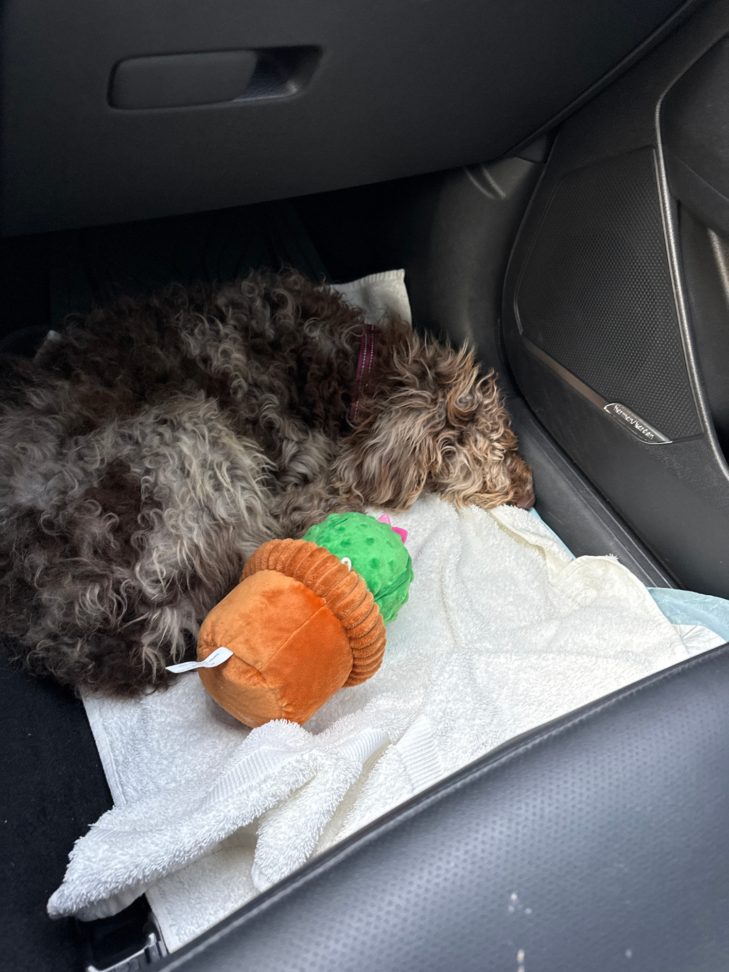 A brown and gray dog lies on a white towel in the footwell of a car. The dog is curled up with two stuffed toys, one green and one brown. The interior of the car is black. The location is Puebla, Mexi…read more