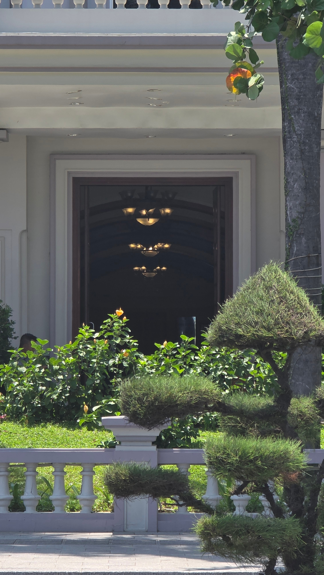 A slightly rotated, eye-level, exterior shot shows the entrance to what is likely a hotel or government building in Nha Trang, Vietnam. The building is a pale white, trimmed in pale gray. The doorway…read more