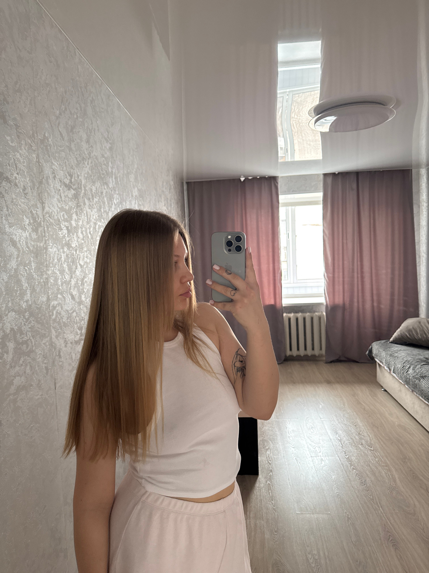 A person is taking a selfie in a room. The room appears to be a bedroom with a bed and window visible. The blinds are drawn. A radiator is next to the window. The walls and floor are light colored. It…read more