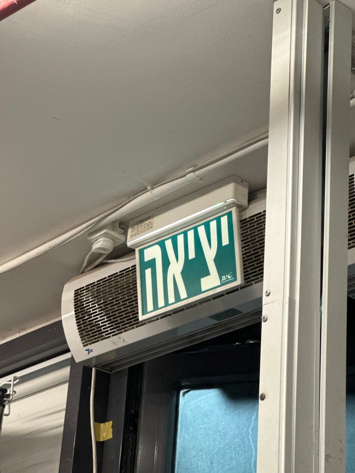The image displays an indoor scene, likely within a commercial or industrial building in Tel-Aviv, Israel, focusing on a prominent emergency exit sign and an adjacent air conditioning unit. The centr…read more