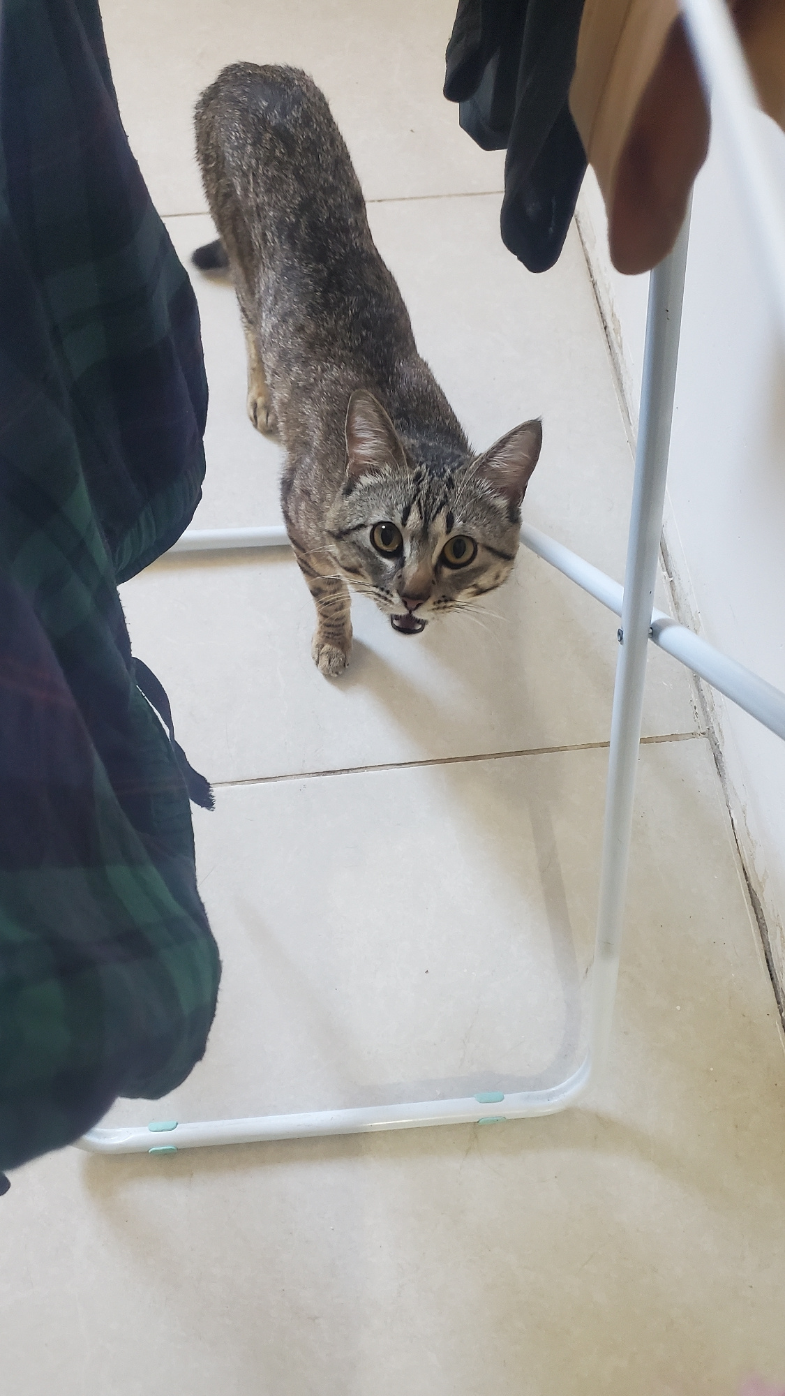 This image, reportedly located in Curitiba, Brazil, captures an indoor domestic scene. The central subject is a short-haired tabby cat, exhibiting a grey-brown coat with distinct darker stripes. The c…read more