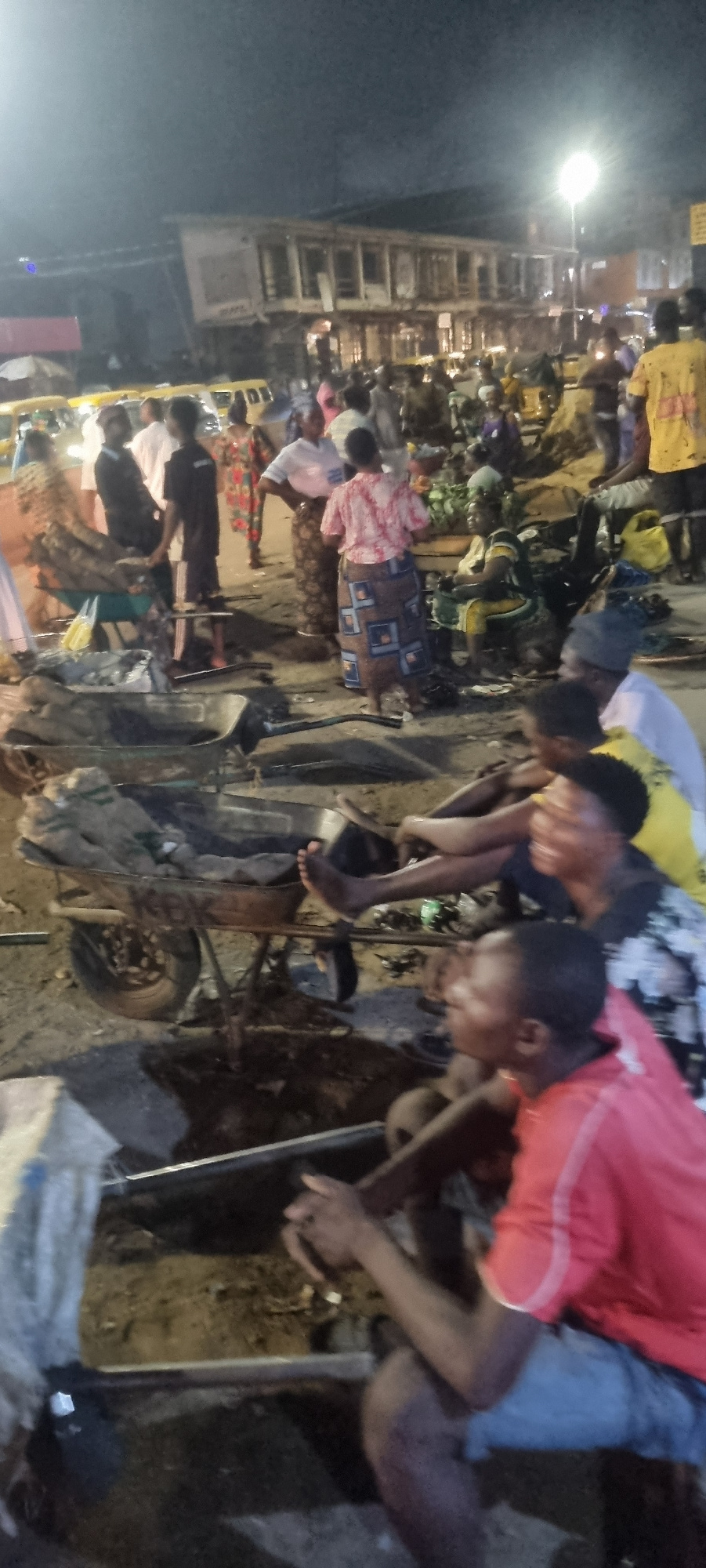 The image captures a scene in Lagos, Nigeria, focusing on a group of people gathered around what appears to be a damaged or disabled vehicle. The location seems to be an open area with streetlights in…read more