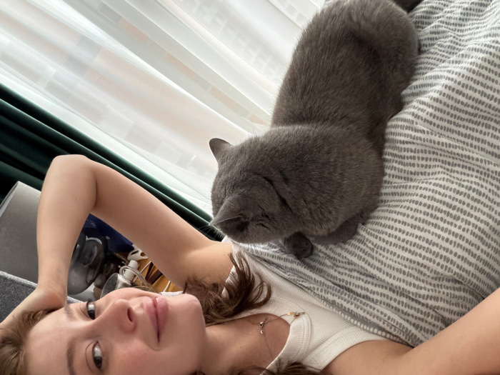 The image depicts an indoor scene in the city of Tbilisi, Georgia, featuring a young adult female and a solid grey cat, likely a British Shorthair. The female, positioned in the lower half of the fram…read more