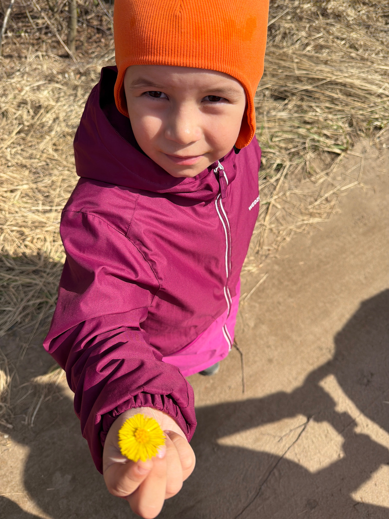The image features a young child captured from a top-down perspective, outdoors in Chaikovsky, Russia. The child, likely a toddler or preschooler, is wearing a bright orange knit beanie and a two-toneβ¦read more