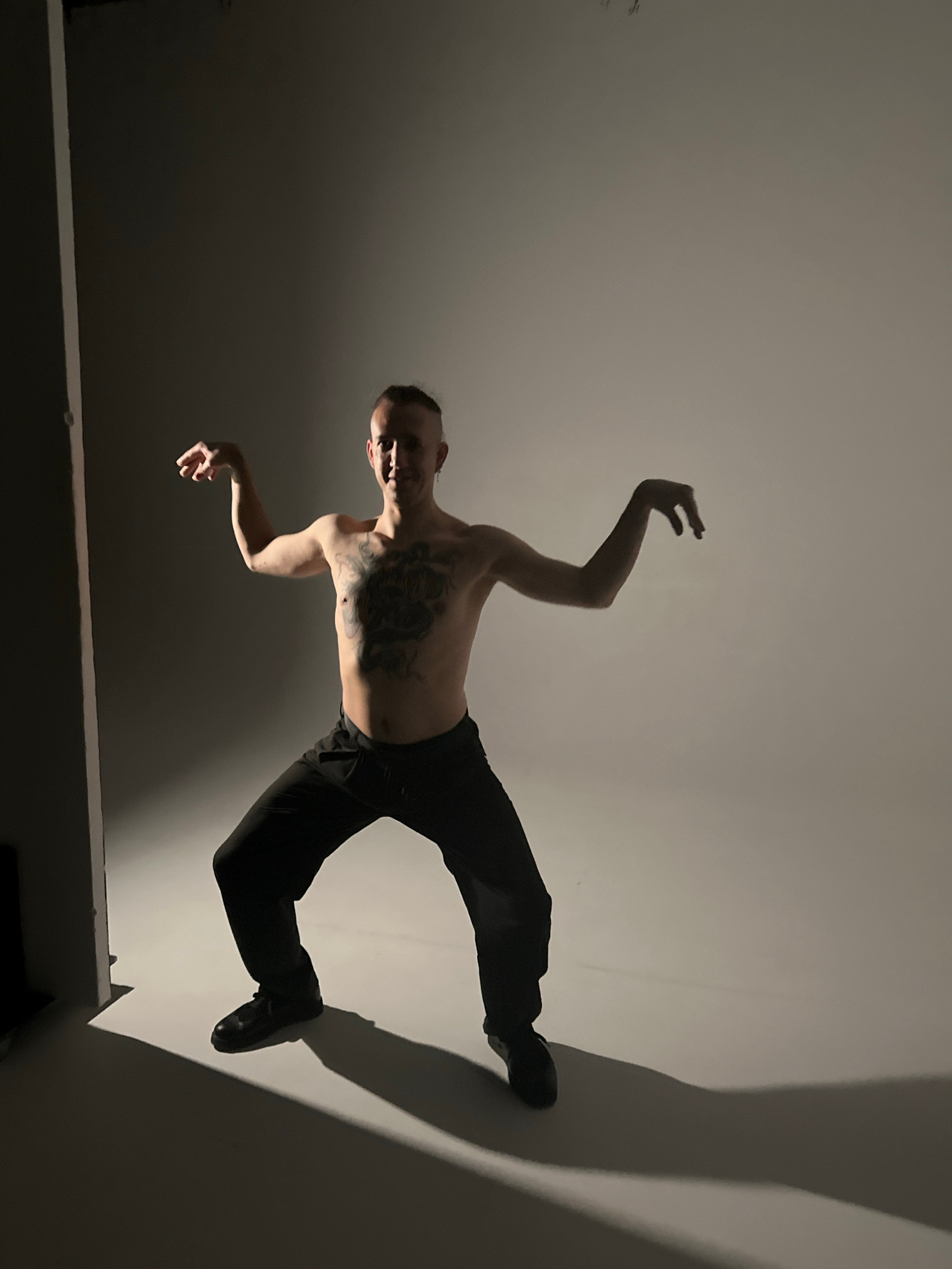 The image displays a single adult male subject performing a dynamic pose in an indoor photography studio environment. The location is specified as Saratov, Russia. The man has fair skin, short dark ha…read more