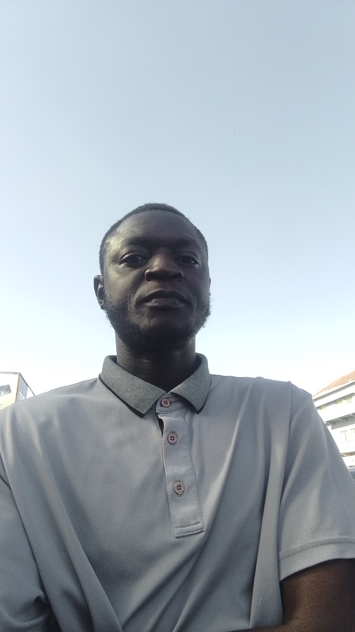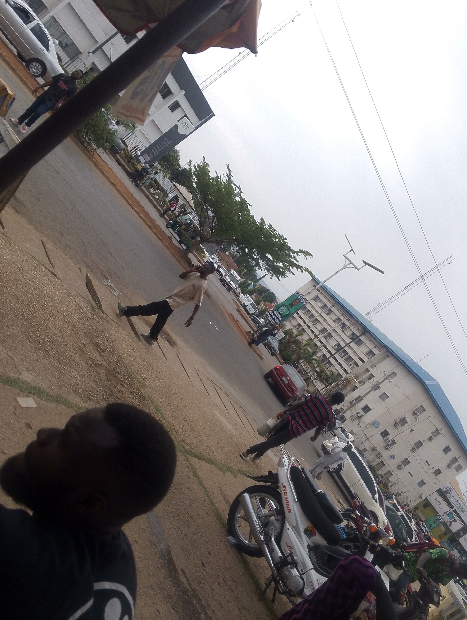 The image captures a tilted, low-angle view of a bustling urban street scene in Jos, Nigeria, under an overcast sky. In the immediate foreground, the top of a person's head and shoulder are visible on…read more