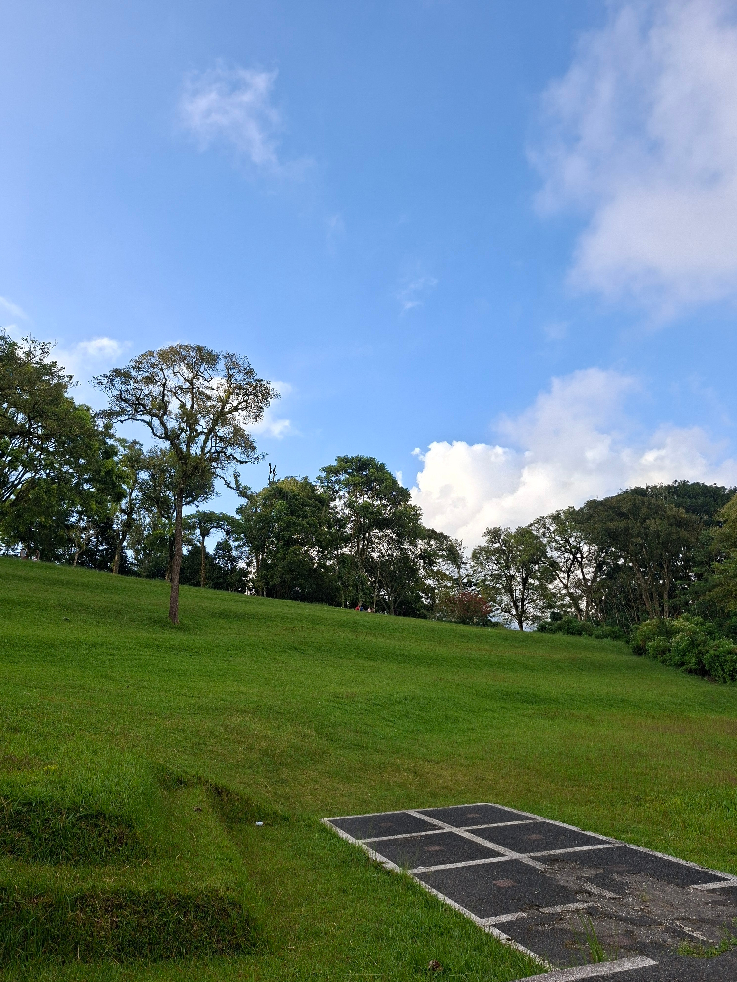 The image depicts a landscape in Baturiti, Indonesia. A predominantly green lawn slopes upwards from left to right. On the right edge is a square black asphalt pad with white painted square divisions.…read more