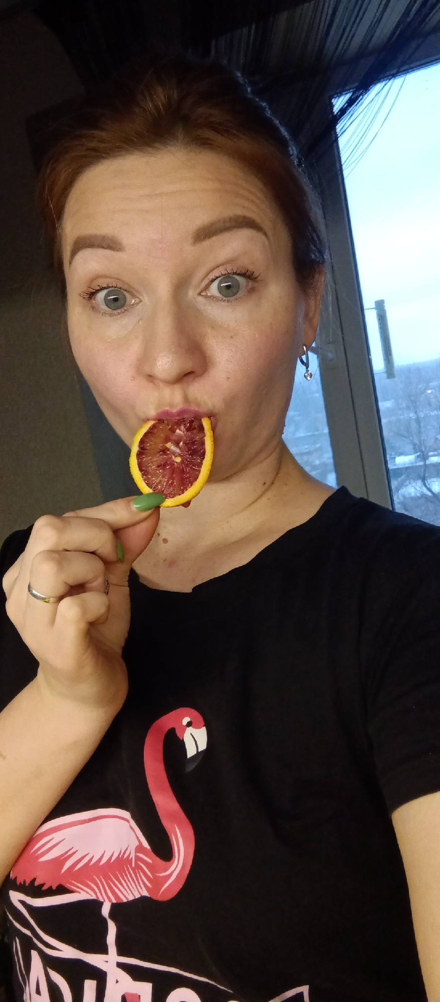 A selfie shows a Caucasian woman with reddish hair and blue eyes holding a slice of blood orange in front of her mouth. She has on an earring and a black t-shirt with a flamingo design. In the backgro…read more
