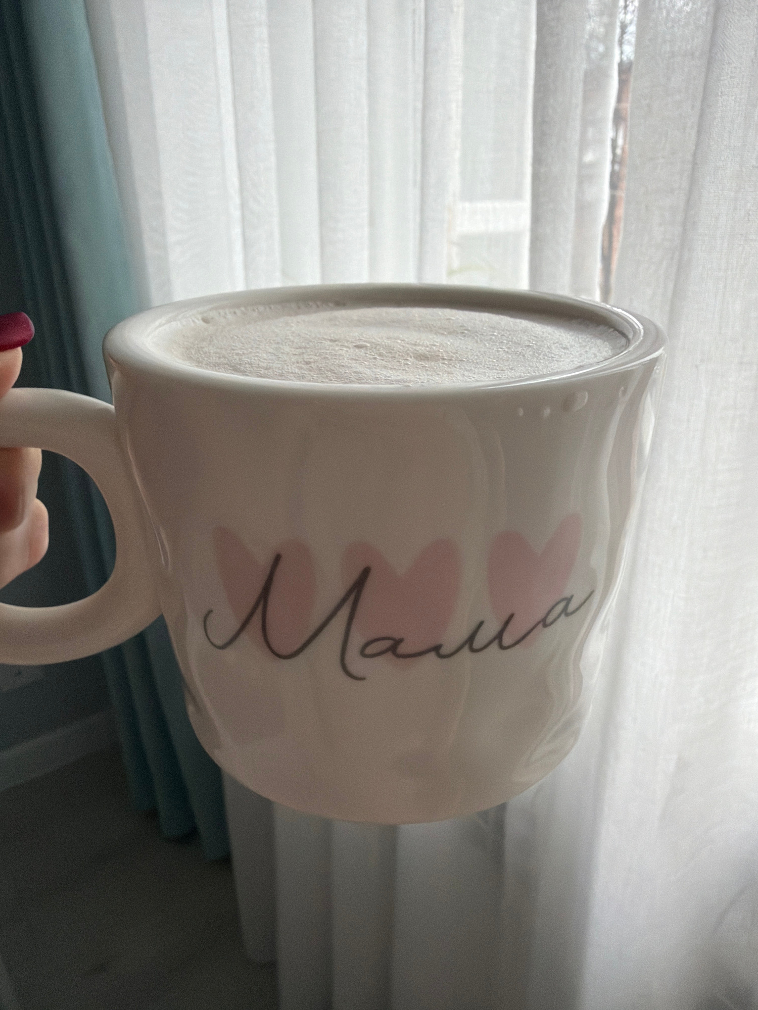 The image shows a white ceramic mug with the word "Mama" written on it in a decorative script with pink heart accents. The mug appears to be filled with a foamy, light-colored beverage, possibly coffe…read more