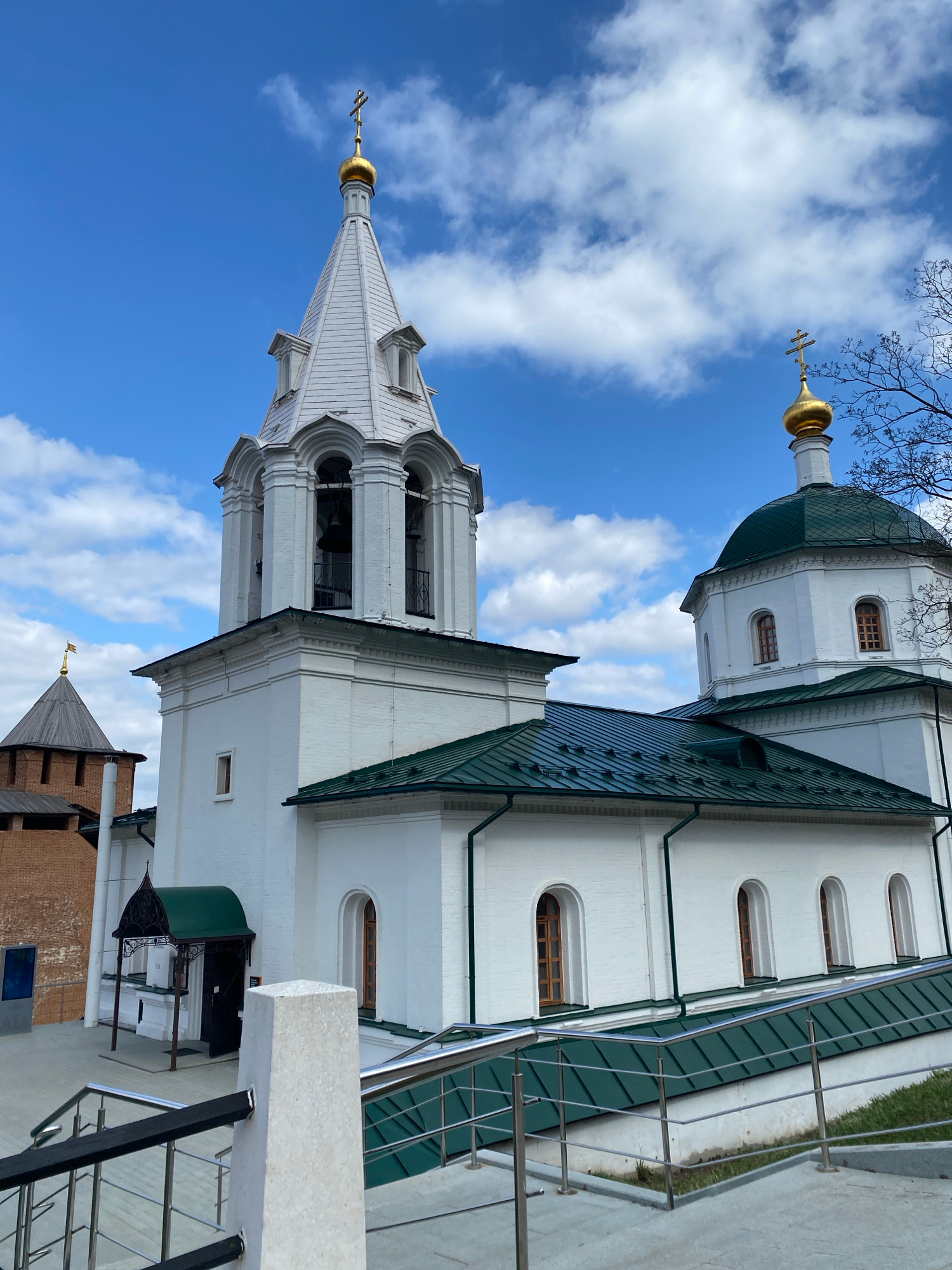 This image captures a vibrant architectural complex, likely a Russian Orthodox church or monastery, set against a bright blue sky dotted with scattered white clouds. The primary subject is a large, pr…read more