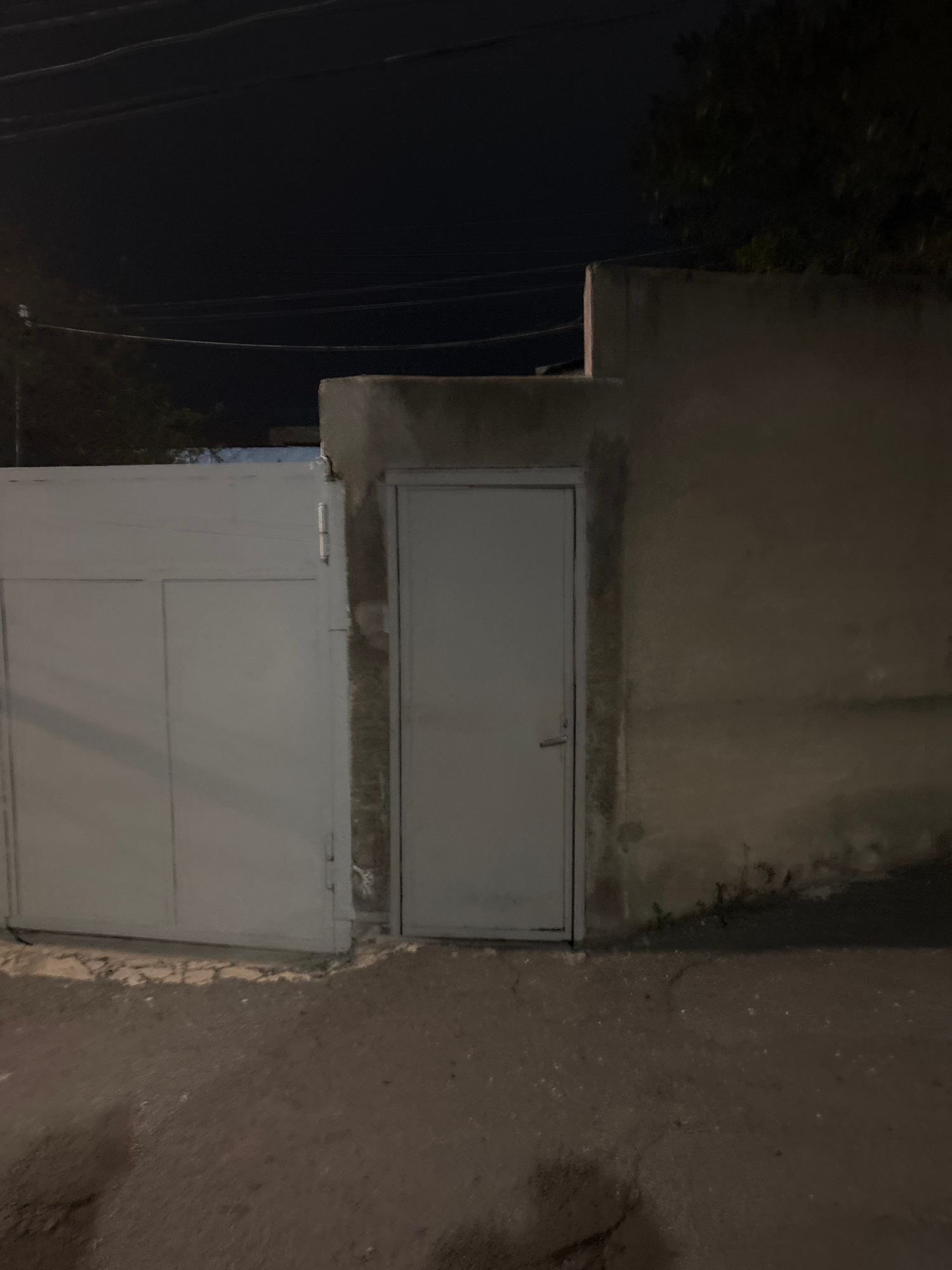 Captured at night, the image shows a section of a building exterior in Yerevan, Armenia. The facade is composed of concrete or a similar material. The structure includes two doors or access panels, on…read more