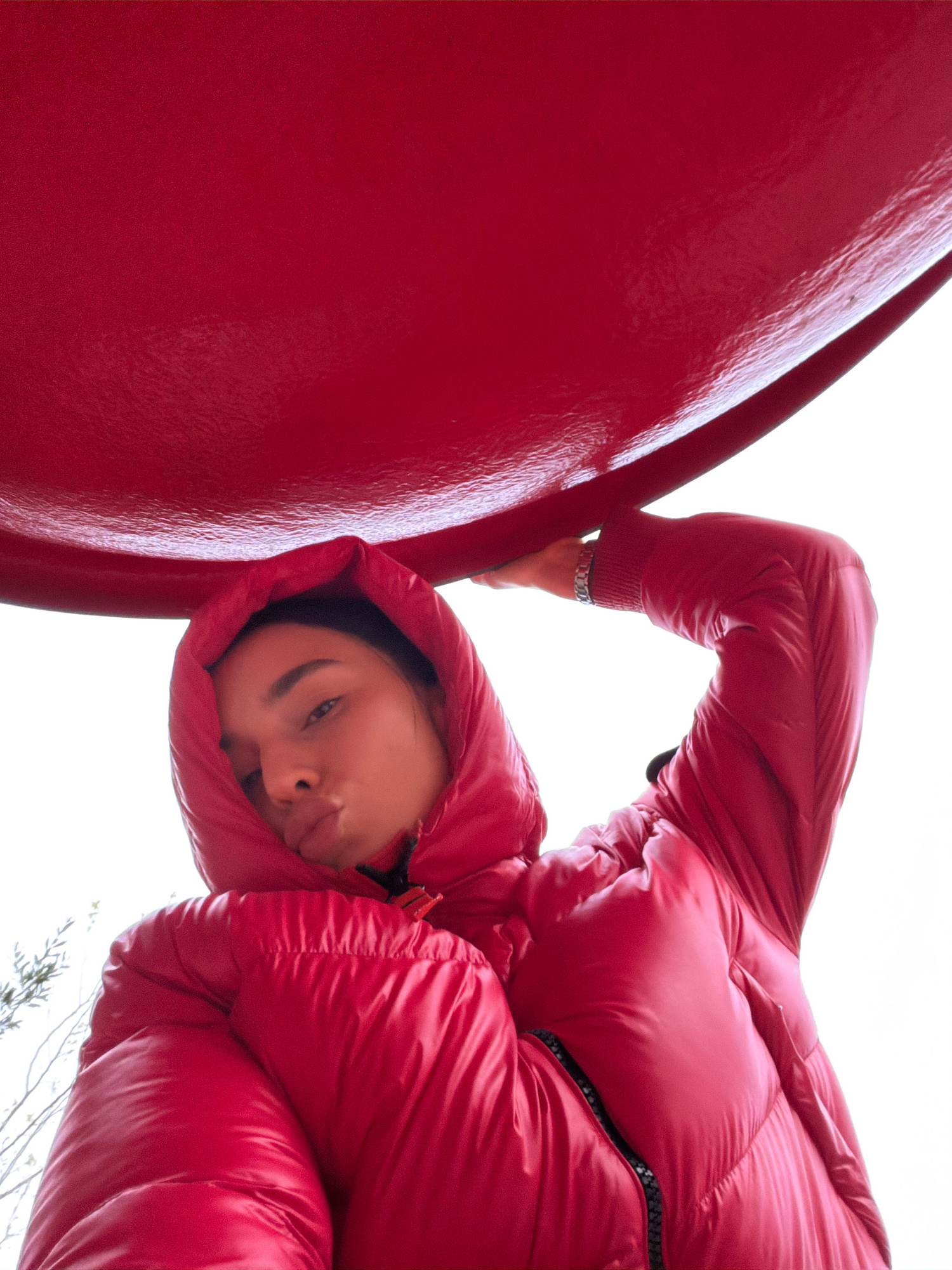A woman in a puffy red jacket is pictured from a low angle, possibly a selfie. She is standing next to a large, smooth, red, rounded object. The woman's face is framed by the hood of her jacket, and s…read more
