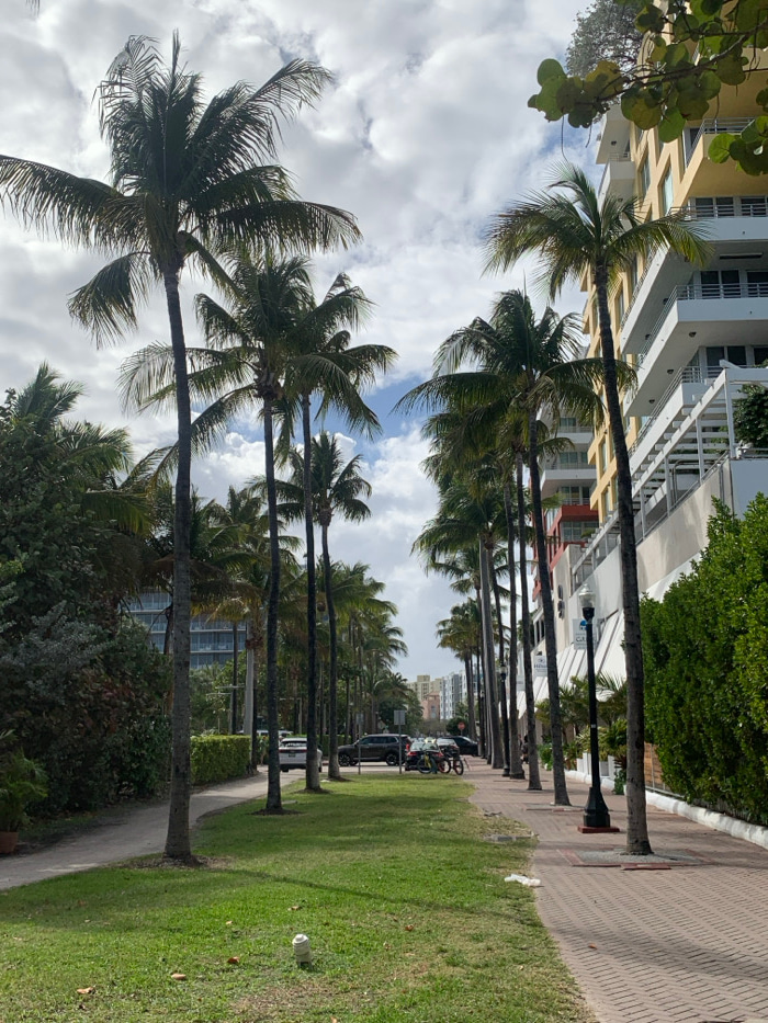 The image depicts a tree-lined street scene in Miami Beach, Florida, United States of America, specifically along Collins Avenue near the Hilton Cabana Miami Beach hotel, visible on the right. The en…read more