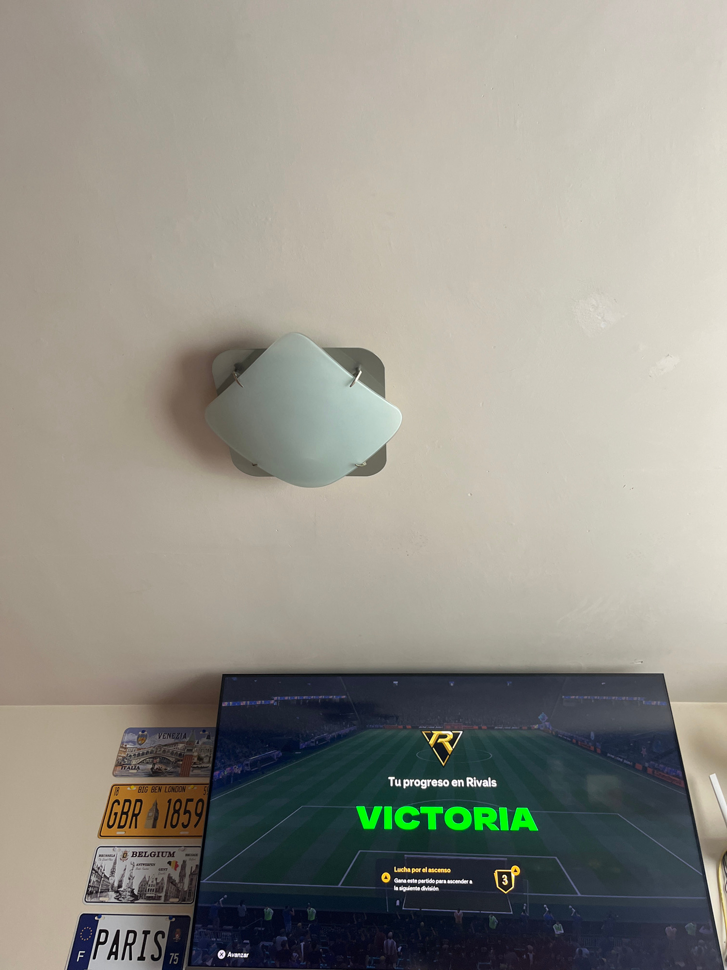 A medium shot captures a wall with a light fixture, a TV screen displaying a soccer game, and license plates. The light fixture, mounted on the wall's left side, is a square-shaped object with rounded…read more