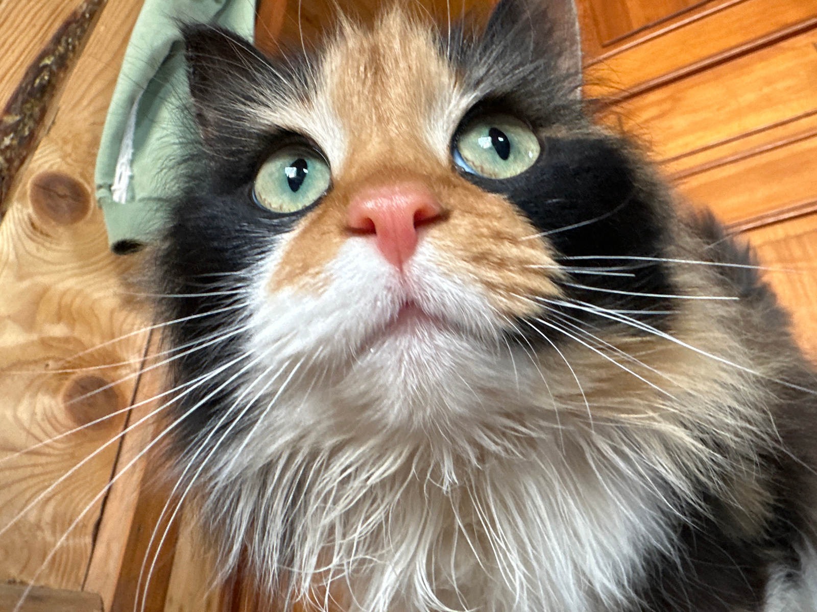 A close-up, eye-level shot features a calico cat with green eyes, a pink nose, and long white whiskers. The cat's fur is a mix of black, orange, and white. A light green object appears in the upper le…read more