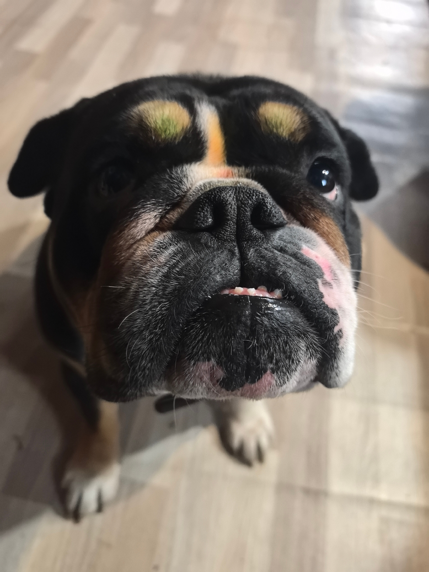 A close-up, upward-angled view of a black, tan, and white English Bulldog. The dog is looking directly at the camera with a slightly upturned gaze. Its wrinkled face and short, stubby teeth are visibl…read more