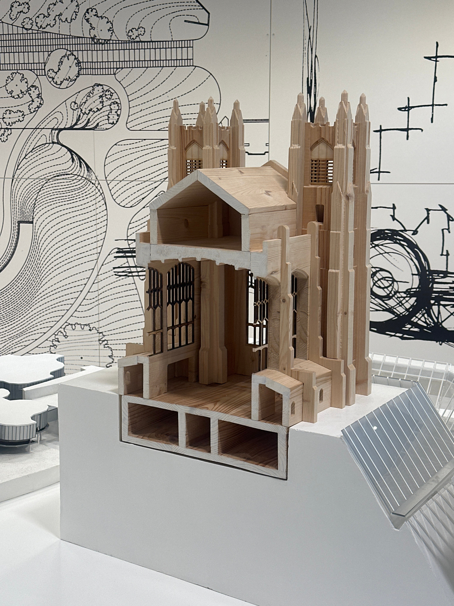 The image depicts a detailed architectural model, likely of a church or cathedral, constructed from light-colored wood. The model showcases intricate layers and structural elements, including windows,…read more