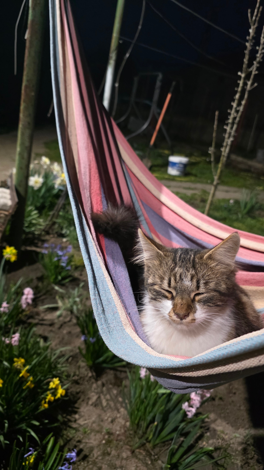An outdoor, vertical format image depicts a domestic tabby cat sleeping in a striped fabric hammock at night, located in the city of Unknown, Unknown. The cat, exhibiting brown and grey tabby patterns…read more