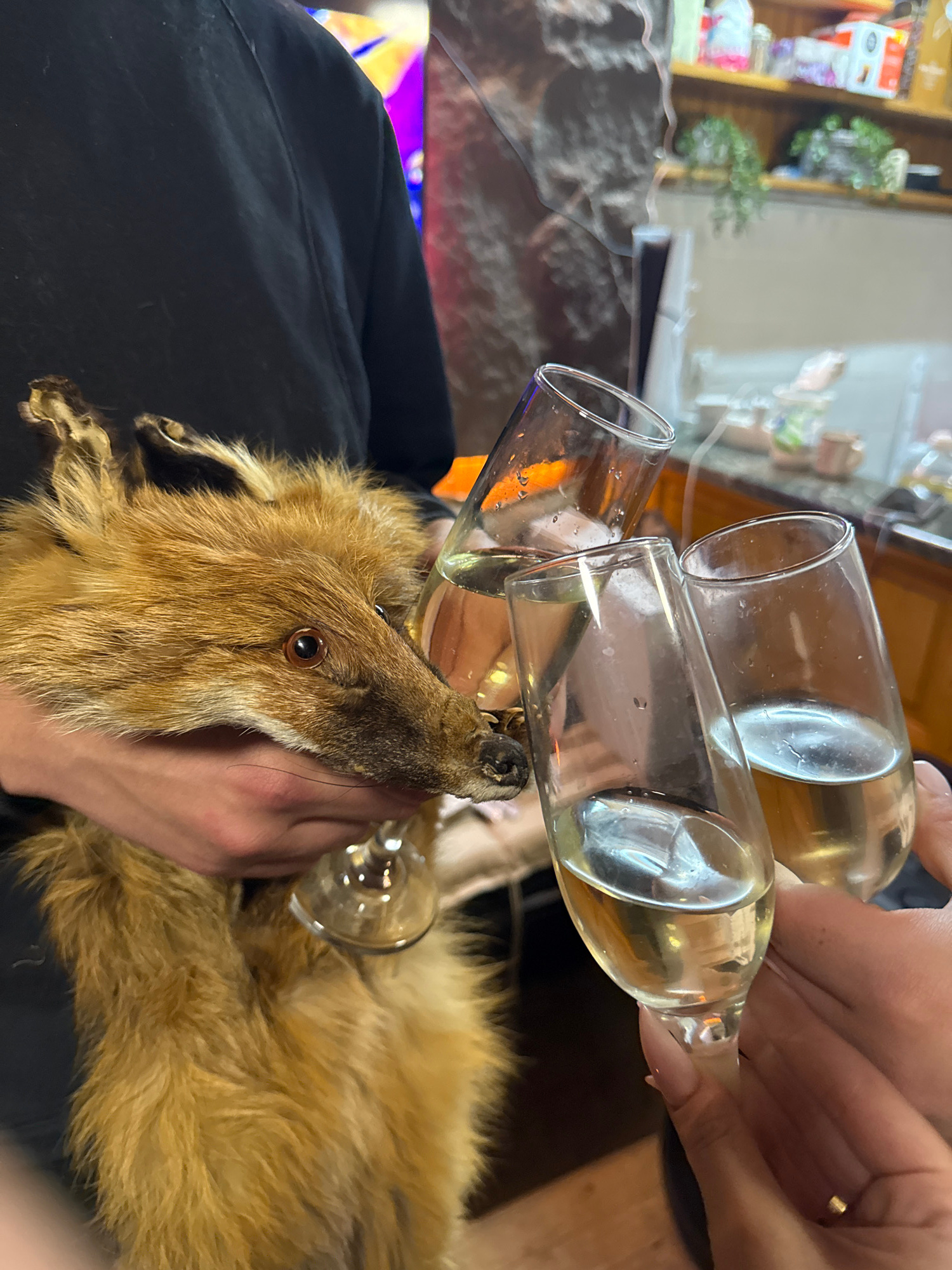A human holds three champagne glasses filled with a light-colored liquid over a taxidermied fox. The location is unknown, and there is no information about Lilkovo, Bulgaria. The human hands are visib…read more
