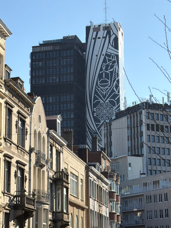 This forensic description details an urban landscape in Ixelles - Elsene, Belgium, focused on the IT Tower at Avenue Louise. The image, captured in clear daylight under a bright blue sky, features a m…read more